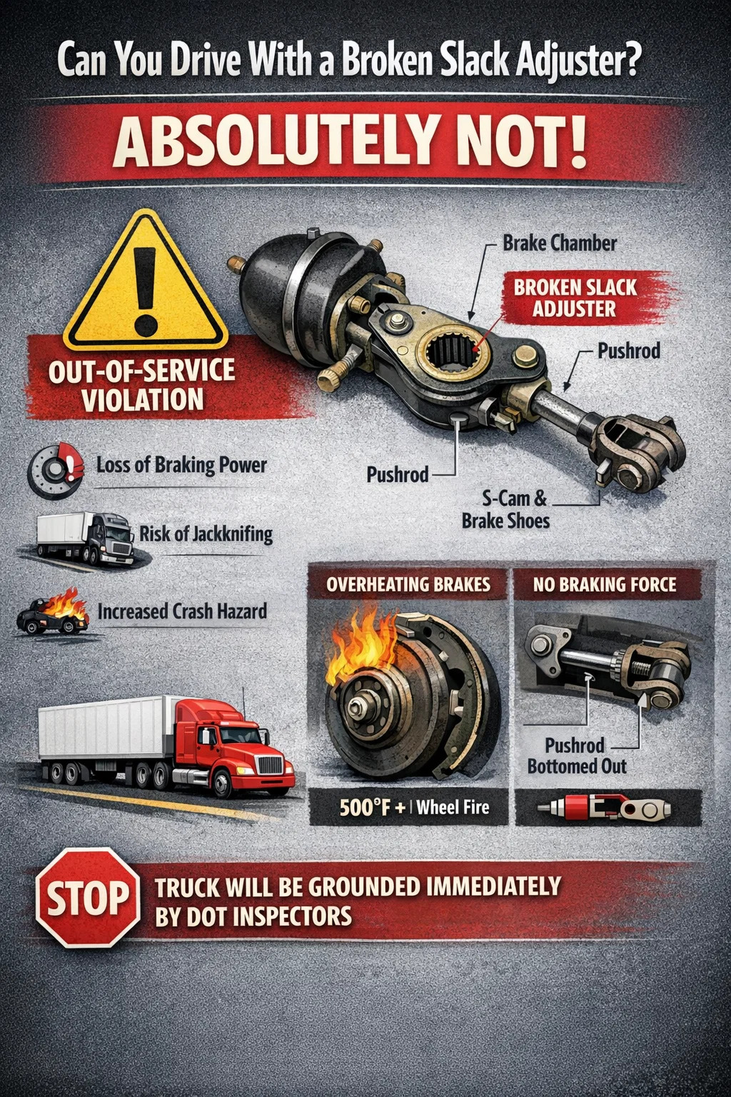 Răspunsul scurt este absolut nu. Nu puteți conduce în mod legal sau în siguranță un vehicul comercial cu un dispozitiv de reglare a jocului rupt, defect sau reglat incorect. În ochii Departamentului de Transport (DOT) și a inspectorilor de siguranță, un rupt reglator de slăbiciune este o încălcare „în afara serviciului”. Dacă sunteți surprins conducând un vehicul cu acest defect, camionul dumneavoastră va fi legat imediat la pământ la locul de inspecție.