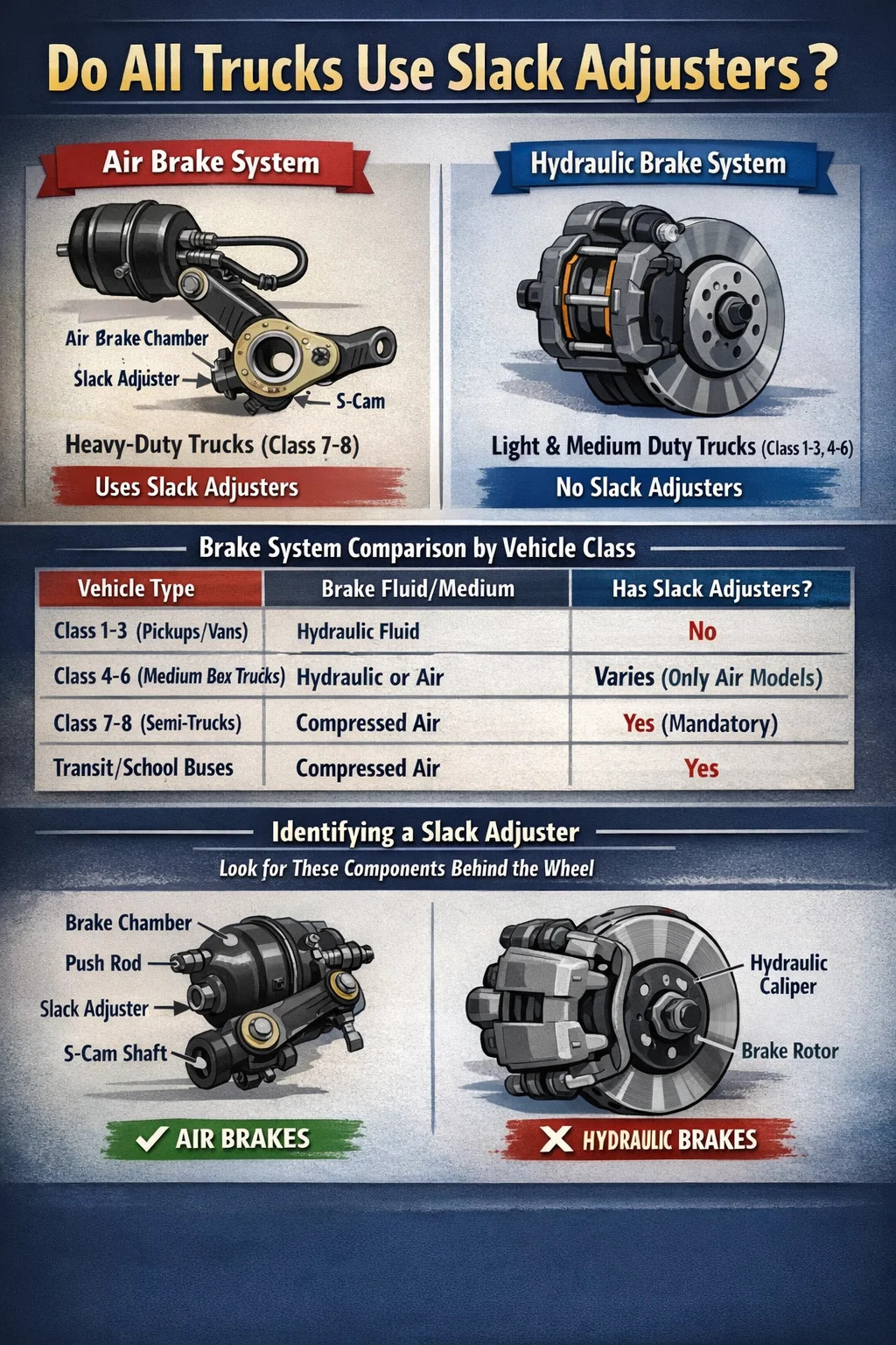 nu, nu toate camioanele au dispozitive de reglare a slăbirii. Dacă un camion este echipat cu aceste componente depinde în întregime de sistemul său de frânare. Mai exact, reglatori de slăbiciune sunt o parte fundamentală a sistemelor de frânare cu aer care se găsesc pe vehiculele comerciale grele (camionete Clasa 7 și Clasa 8). Camioanele ușoare, cum ar fi pickup-urile standard (Clasa 1-3) și multe camioane cu cutie pentru sarcini medii folosesc sisteme de frânare hidraulice, care nu utilizează un mecanism de reglare a slăbirii pentru a menține spațiul de frână sau plăcuțe.
