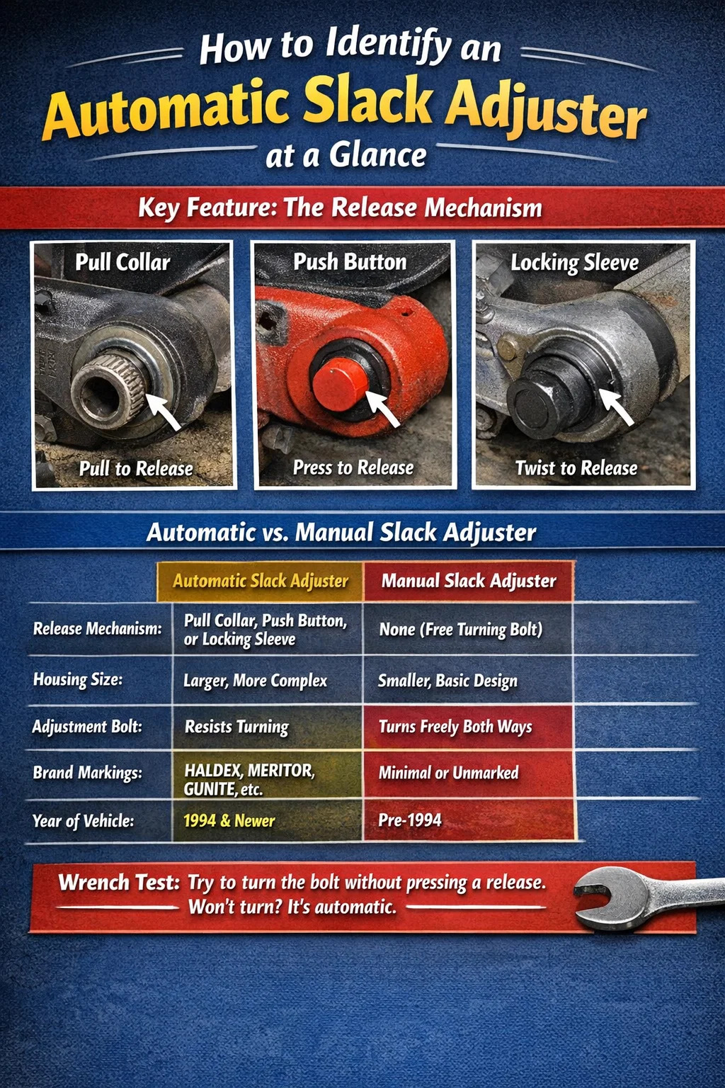 Înainte de a intra în identificarea fizică, ajută la înțelegerea contextului de reglementare. Sub 49 CFR 393,53 , Federal Motor Carrier Safety Administration (FMCSA) cere ca toate vehiculele comerciale cu frânare cu aer fabricate pe sau după 20 octombrie 1994 să fie echipate cu dispozitive de reglare automată a jocului. Acest lucru se aplică tractoarelor, remorcilor, autobuzelor și oricărui alt CMV frânat cu aer de peste 10.000 lbs GVWR.