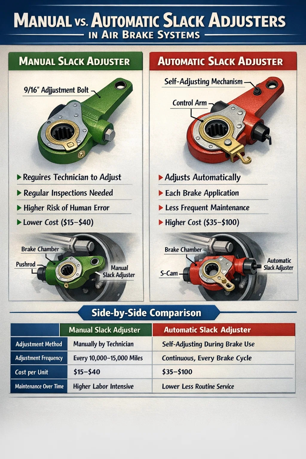 Înțelegerea ambelor tipuri contează, indiferent dacă sunteți un manager de flotă, un șofer comercial, un tehnician în frânare sau cineva care studiază pentru un CDL. Reglementările federale în temeiul FMCSA 393.47 stabilesc limite stricte pentru deplasarea tijei de împingere, iar eșecul unei inspecții din cauza frânelor nereglate poate pune la pământ un vehicul imediat. Cunoașterea modului în care funcționează fiecare tip de dispozitiv de reglare a jocului – și ce poate merge prost cu fiecare – menține vehiculele conforme, în siguranță și pe drum.